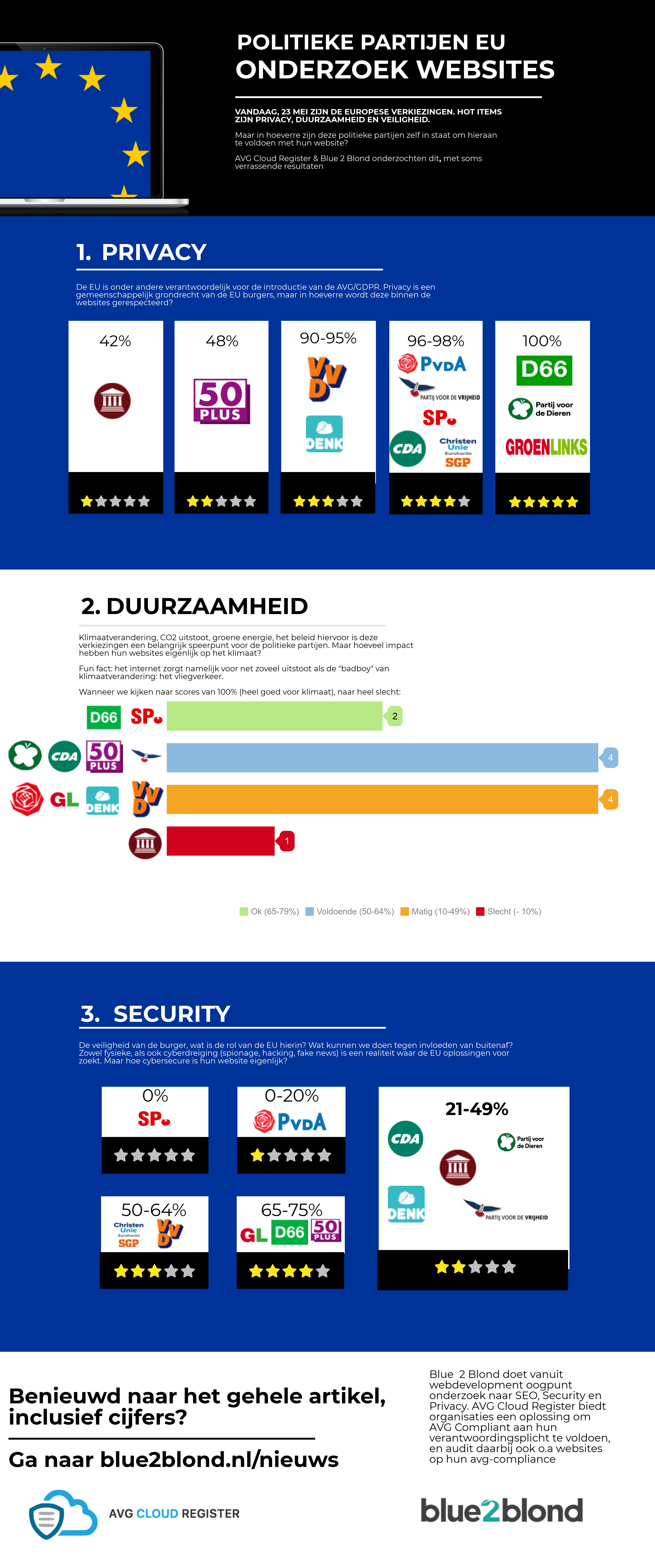 Vandaag zijn onze verkiezingen voor de EU. Maar hoe goed doen deze partijen het eigenlijk zelf op o.a Privacy, Duurzaamheid en Security op hun website? Samen met Blue 2 Blond onderzochten wij dit. Wat blijkt? Forum van Democratie vindt de privacy niet erg belangrijk, SP neemt het niet zo nauw met je veiligheid , Groenlinks is niet erg duurzaam.
